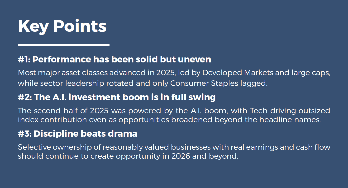 The sharp selloff that followed Liberation Day was the latest reminder that headlines can move prices quickly, but fundamentals and cash flow ultimately drove longer-term returns. Investors who stayed invested through the turbulence were rewarded handsomely as conditions stabilized, valuations expanded and earnings momentum strengthened.